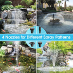 A: The fountain kit includes multiple nozzles offering a variety of water spray shapes to enhance your pond’s visual appeal.