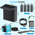 A: The complete kit includes 1×13.4" stainless steel waterfall box (with 4 filter brushes and solar LED strip), 1×40W pump (660GPH), 1×9.8FT corrugated tubing (assembled), 1×filter bag, adhesive, installation accessories, and a user manual.