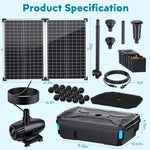 A: The complete kit includes: 1x 70W solar panel, 1x 680GPH pond pump, 1x filter box, filter pads, filter sets, bio-balls, nozzles, and tubing—everything you need for a full water feature setup.